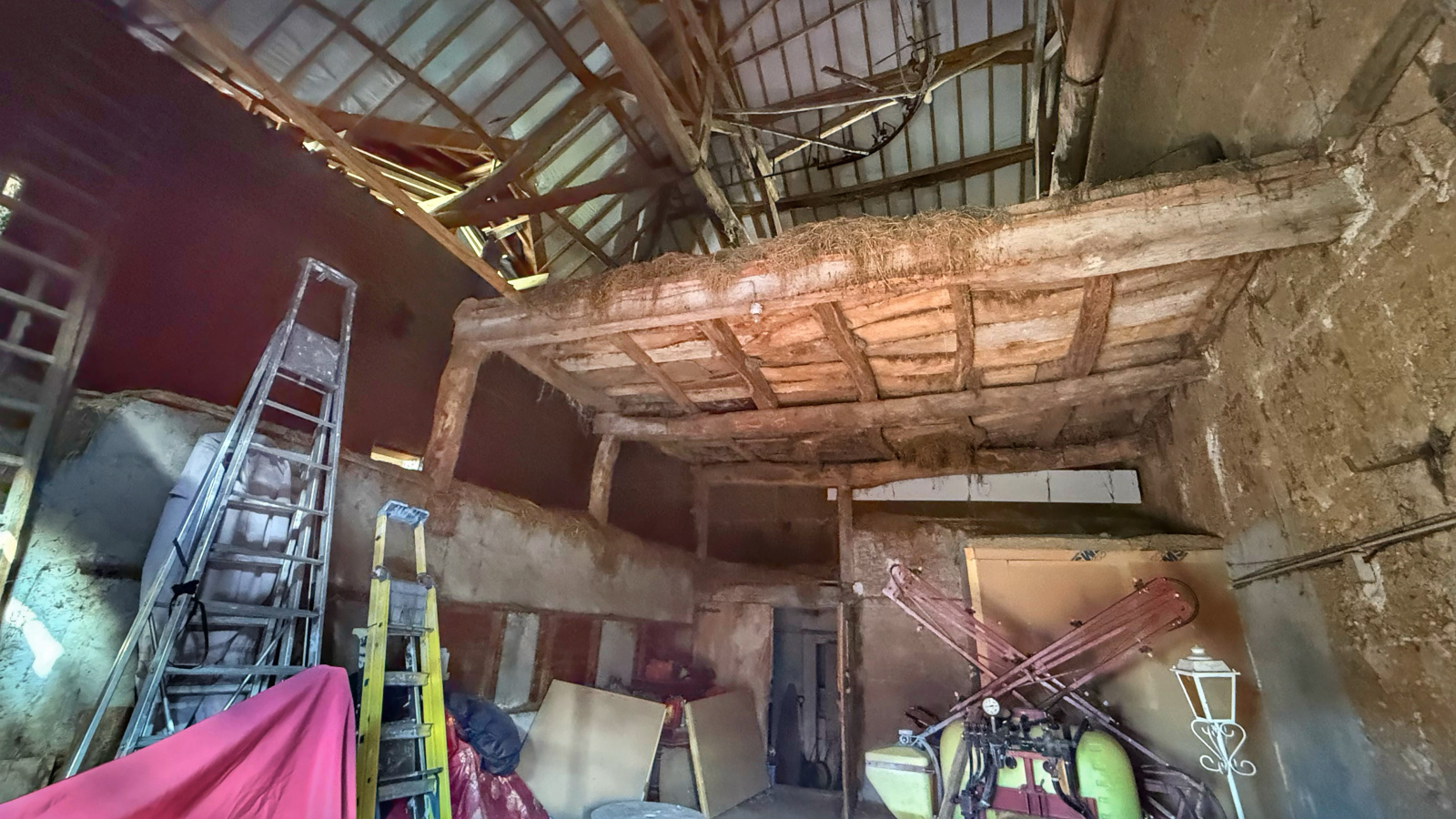 Nous une grange avec atelier de 95,45 m² au sol (avec le chauffe-eau), pouvant être aménagée sur plusieurs niveaux grâce à sa hauteur sous toiture d’environ 9 mètres.